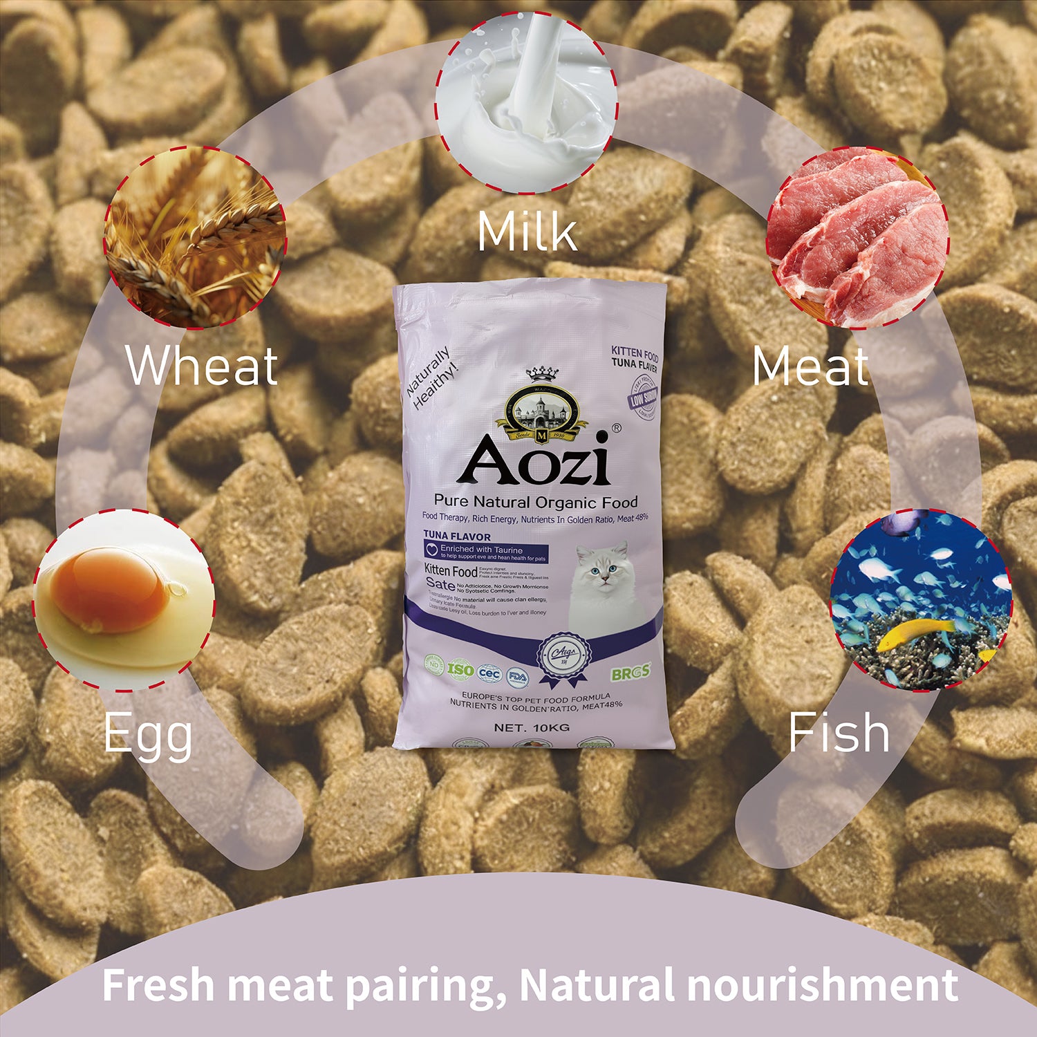 Made from quality ingredients, Aozi cat food ensures a reliable source of nutrition. The packaging highlights the protein content, emphasizing its importance for cats. No additional features or qualities are specified. 🐾